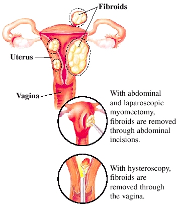 is the removal of fibroids (benign noncancerous tumors) from the outer(serosal), Middle(muscular), or inner(mucosal) wall of the uterus. Myomectomy is the preferred treatment for symptomatic fibroids(ex: pain, heavy bleeding, large size) in women who want to keep their uterus. Larger fibroids are ususally removed with an abdominal incision, but small fibroids can be taken out using laparoscopy or hysteroscopy.